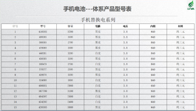 手机电池---体系产品型号表